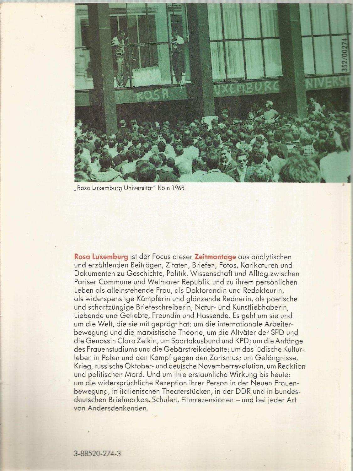 Rosa Luxemburg ist der Focus dieser Zeitmontage aus analytischen und erzählenden Beiträgen, Zitaten, Briefen, Fotos, Karikaturen und Dokumente zu Geschichte, Politik, Wissenschaft und Alltag zwischen Pariser Commune und Weimarer Republik und zu ihrem persönlichen Leben als alleinstehende Frau, als Doktorandin und Redakteurin, als widerspenstige Kämpferin und glänzende Rednerin, als poetische und scharfzüngige Briefeschreiberin, Natur- und Kunstliebhaberin, Liebende und Geliebte, Freundin und Hassende. Es geht um sie und um die Welt, die sie mit geprägt hat: um die internationale Arbeiterbewegung und die marxistische Theorie, um die Altväter der SPD und die Genossin Clara Zetkin, um Spartakusbund und KPD; um die Anfänge des Frauenstudiums und die Gebärstreikdebatte; um das jüdische Kulturleben in Polen und den Kampf gegen den Zarismus; um Gefängnisse, Krieg, russische Oktober- und deutsche Novemberrevolution, um Reaktion und politischen Mord. Und um ihre erstaunliche Wirkung bis heute: um die widersprüchliche Rezeption ihrer Person in der Neuen Frauenbewegung, in italienischen Theaterstücken, in der DDR und in bundesdeutschen Briefmarken, Schulen, Filmrezensionen – und bei jeder Art von Andersdenkenden.
